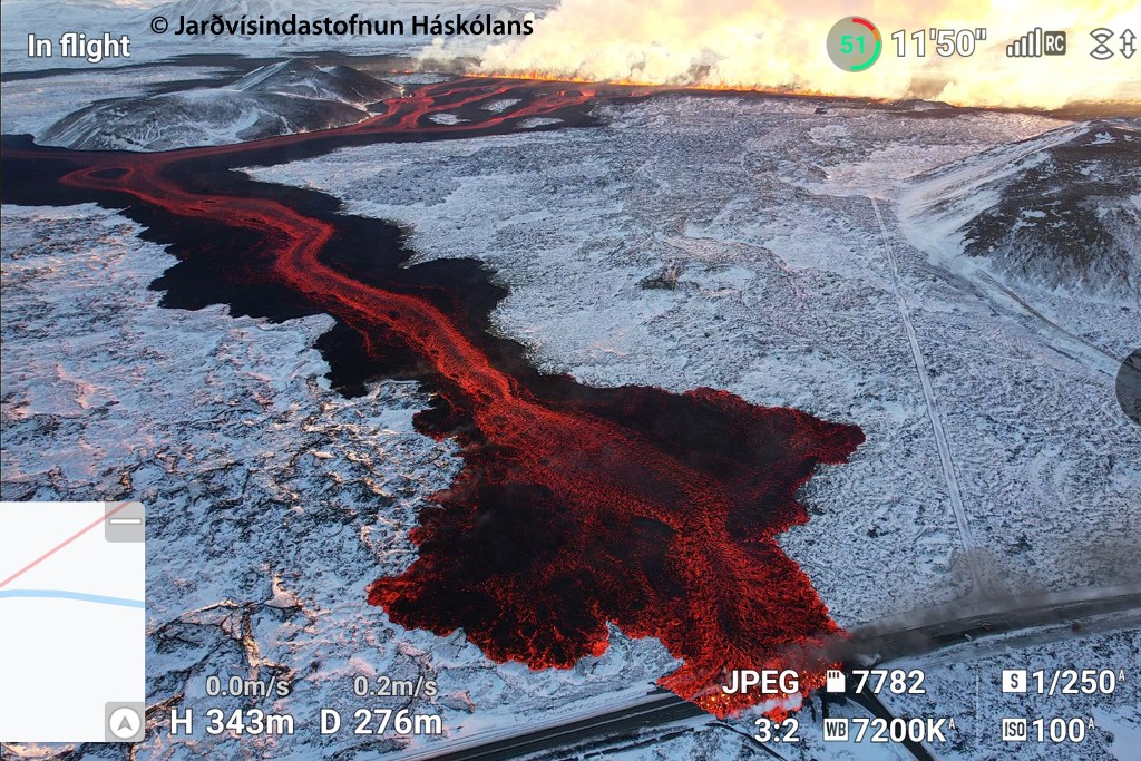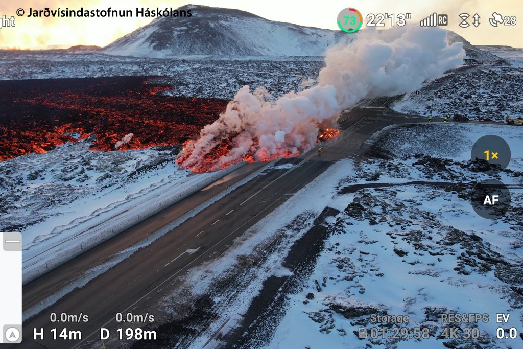 Une coulée principale s’est formée vers l’ouest. Un peu après 11h et 2 km de parcours, elle a atteint la route qui traverse la péninsule de Reykjanes du sud au nord, à l’embranchement avec la route qui mène au célèbre Blue Lagoon ! Sa vitesse est donc d’environ 400 m/h : c’est conséquent ! ![]()