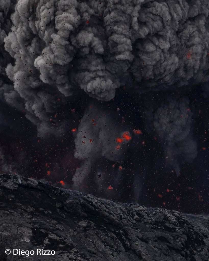 L’activité strombolienne ordinaire en cours depuis 2002, se poursuit sur ce volcan. La fréquence explosive est assez basse en ce moment, avec une à quatre explosions par heure, à l’origine de panaches de cendres de 700 à 1000 mètres de haut qui occasionne quand même quelques retombées de cendres dans certains villages proches. Des fragments plus grossier et incandescents, comme ceux de cette photo, retombent aussi sur les flancs du volcan qu’ils dévalent jusqu’à la végétation… ![]()