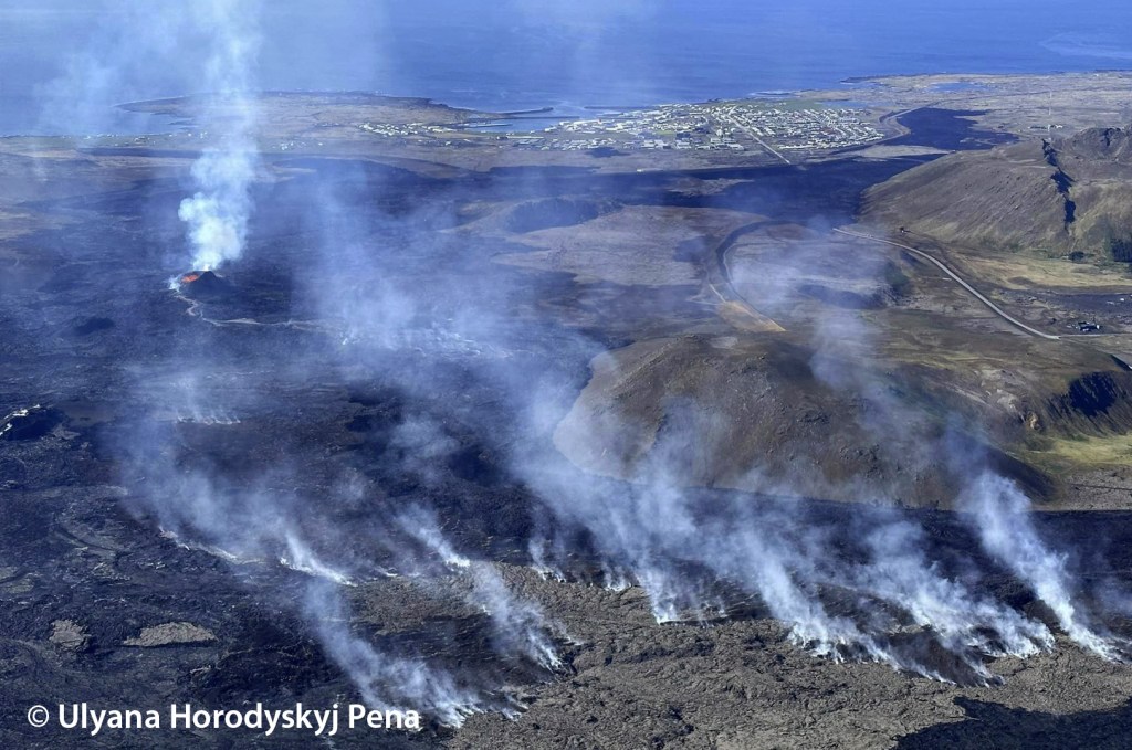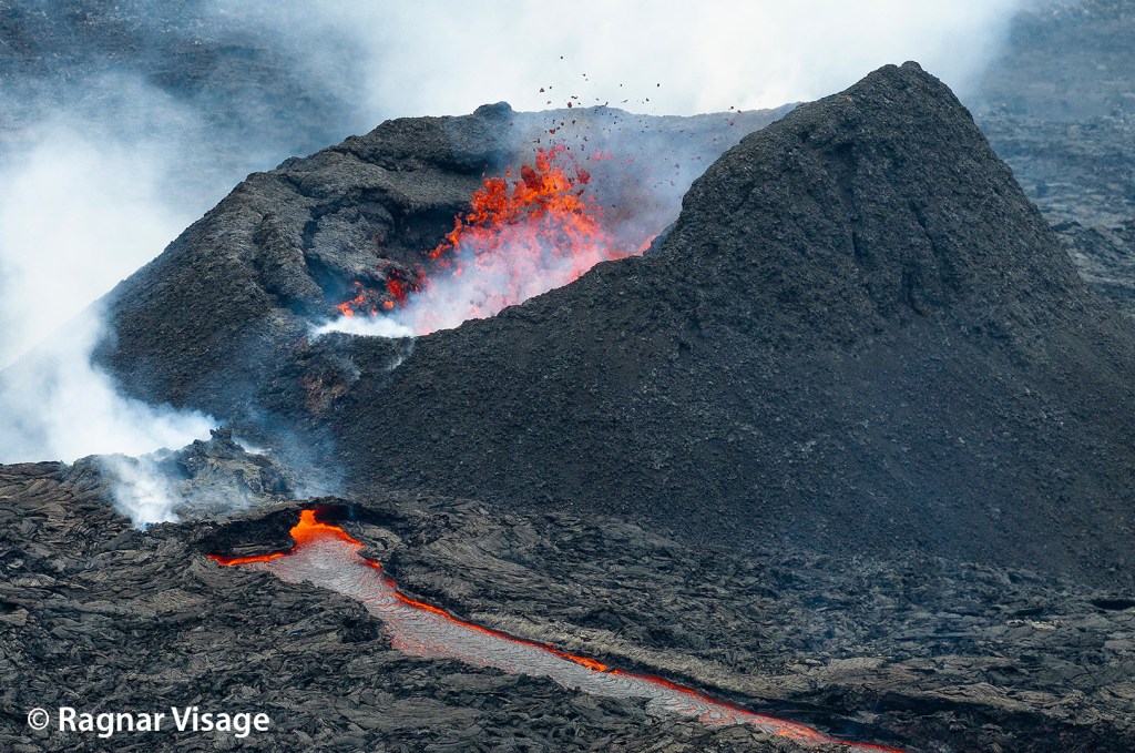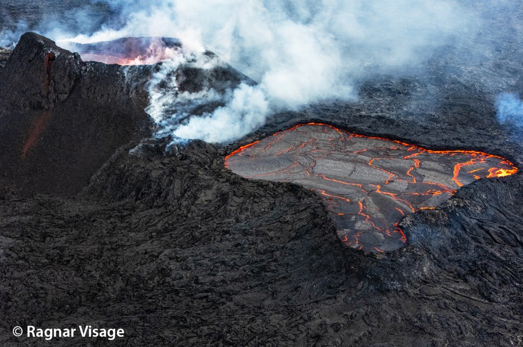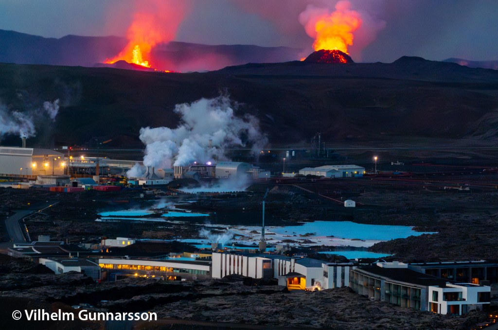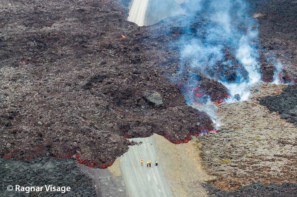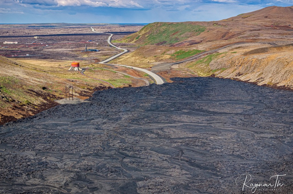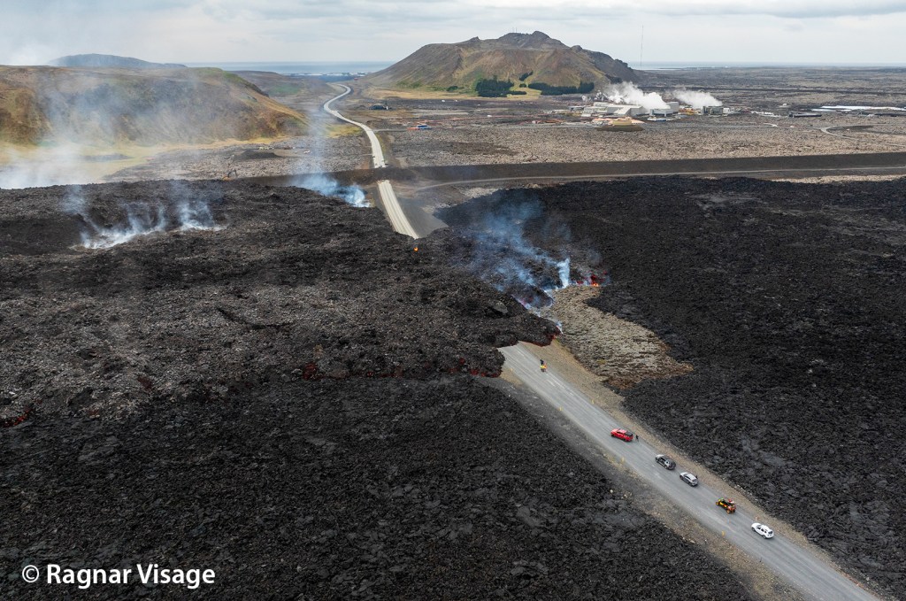 Le relief étant assez plat dans ce secteur, la lave forme des étangs après s’être évacué du cône. Une partie de cette lave s’évacue continuellement vers l’aval, mais il arrive qu’un des bords s’affaissent ce qui engendre des coulées assez rapides. C’est ce qu’il s’est passé le 8 juin : une coulée s’est formée vers le nord, passant pour la troisième fois en quelques mois sur Grindavikurvegur (à cet endroit), la route qui traverse la péninsule. Les talus construits par l’Homme autour de la centrale géothermique et le Blue Lagoon ont encore jouer leur rôle !