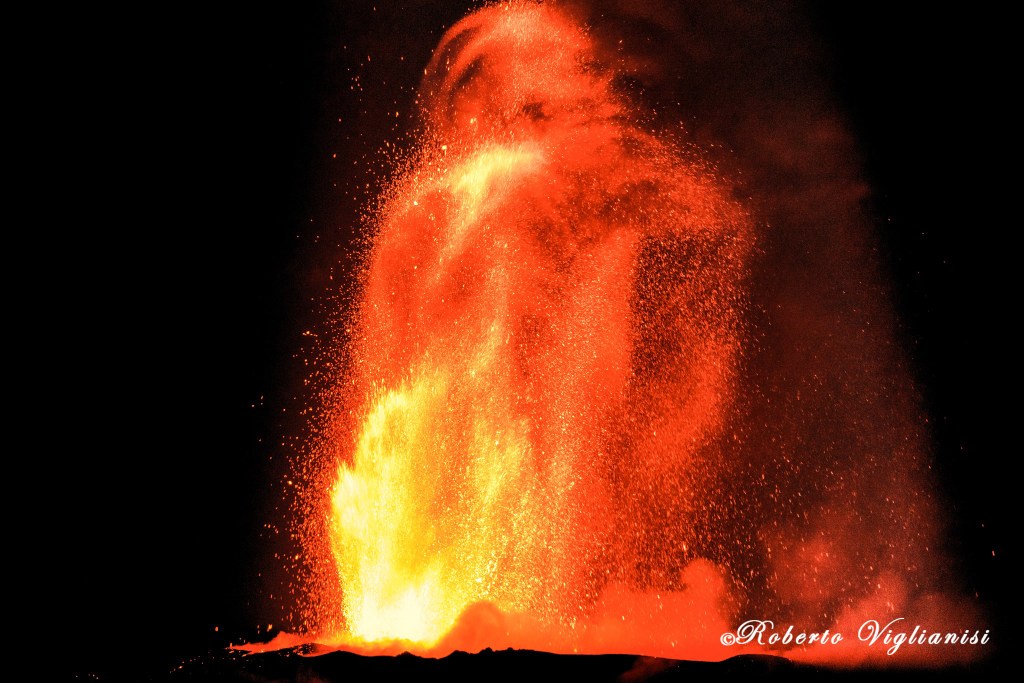 Un troisième paroxysme a eu lieu la nuit dernière au niveau du cratère de la Voragine, après les événements du 4 et du 7 juillet dernier. L’activité explosive a repris sur ce cratère le 14 juillet, puis s’est intensifiée progressivement le lendemain, pour devenir continue vers 22h. Par moments, ces fontaines de lave atteignaient pas loin de 1000 mètres de haut ! Incroyable !