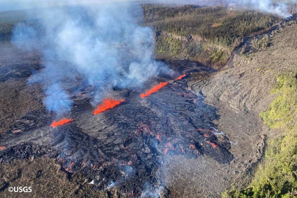 Mais ce n’est que 24 heures plus tard, alors que les signaux déclinaient, que cette intrusion magmatique a percé la surface du volcan une première fois, pour une courte activité à environ 13 km au sud-est de la caldeira sommitale, mais derrière les nuages. Un survol le lendemain permit de constater qu’une fissure éruptive de 480 mètres de long s’était ouverte, avec des coulées de lave qui n’ont couvert que 2 hectares…