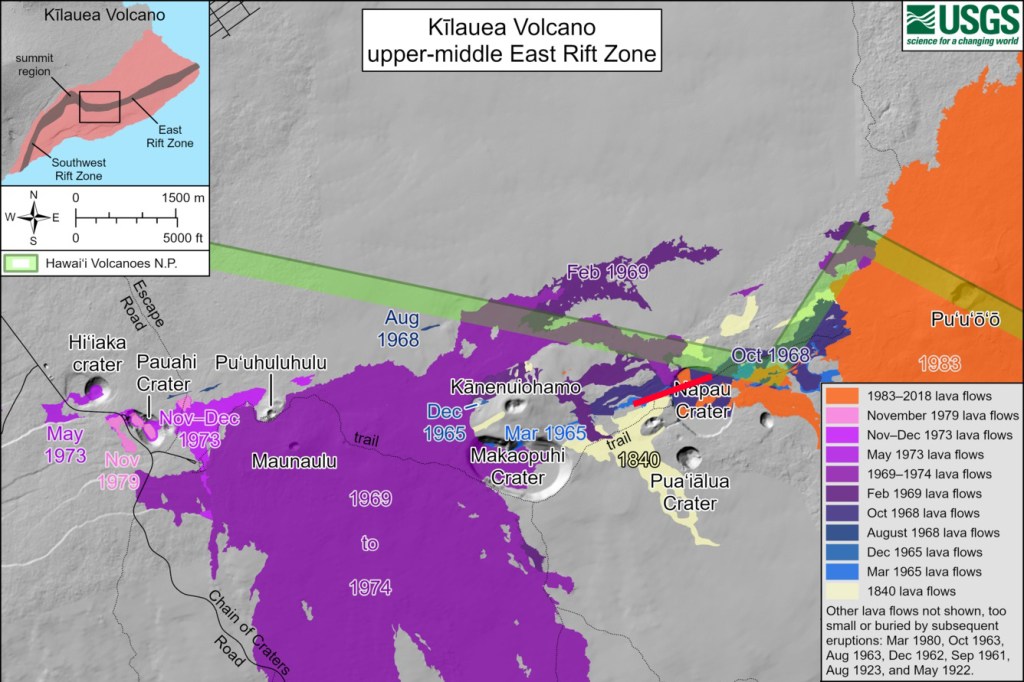 Le volcan s’est ensuite rendormi, jusqu’à ce qu’une nouvelle fissure éruptive s’ouvre vers 4h du matin le 17 septembre, dans le prolongement de la précédente. De 500 mètres de long, elle coupe le cratère Nāpau d’est en ouest et avait recouvert environ 25% de son plancher en 4h de temps. À cette heure, l’éruption est toujours en cours, mais pour combien de temps ?
