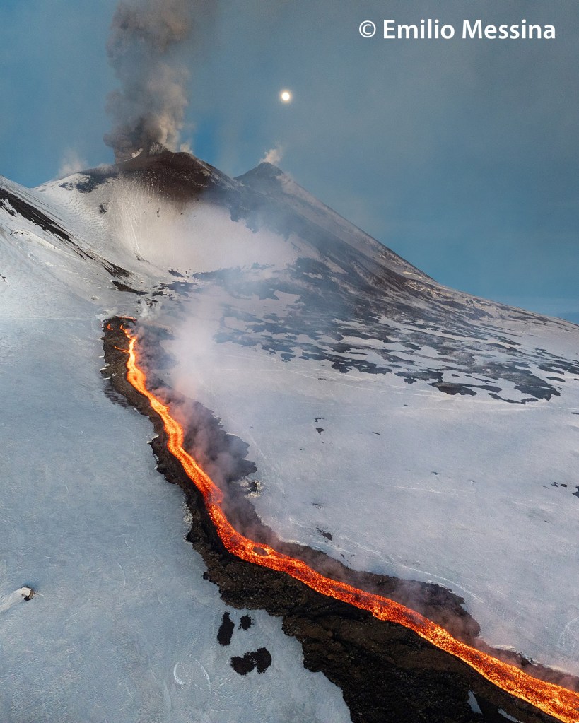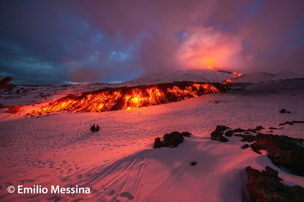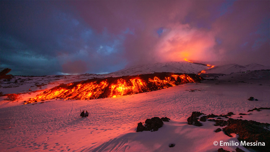 En Sicile, l’Etna est entré en éruption le 8 février. Un évent s’est ouvert au pied sud de la Bocca Nuova, vers 3000 mètres d’altitude et a alimenté une coulée de lave d’une dizaine de mètres de large et d’une épaisseur de 6 à 8 mètres qui s’est épanchée sur le haut flanc sud-ouest du volcan… L’interaction entre la lave et la neige qui couvre la zone sommitale en hiver généra quelques explosions secondaires au niveau du front de la coulée, mais aucun accident n’a été rapporté tandis que de nombreuses personnes ont profité de ce spectacle magique ! En plus de cette activité effusive, une activité strombolienne anima le Cratère Sud-Est, déposant des cendres sur les flancs du volcan… L’activité s’arrêta le 19 février, la coulée s’immobilisant à une altitude de 1840 mètres après 4,3 kilomètres de parcours. L’effusion reprit trois jours plus tard, avec un débit fluctuant, ainsi qu’une activité explosive sur le Cratère Sud-Est assez variable, puis l’activité s’arrêta de nouveau le 2 mars. Reprendra-t-elle ?