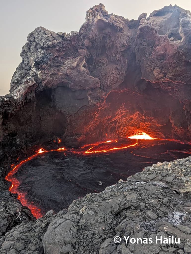 Un des quatre cônes actifs depuis plusieurs mois dans la caldeira de l’Erta Ale en Éthiopie, s’est effondré début avril, laissant observer ce qui se trouvait sans doute à l’intérieur depuis plusieurs mois : une étendue de lave d’une dizaine de mètres de diamètre ! Le dynamisme observé à cet endroit témoigne sans détour d’un lac de lave, soit le sommet d’un conduit éruptif, bien que sa taille atteste plutôt d’une mare…
