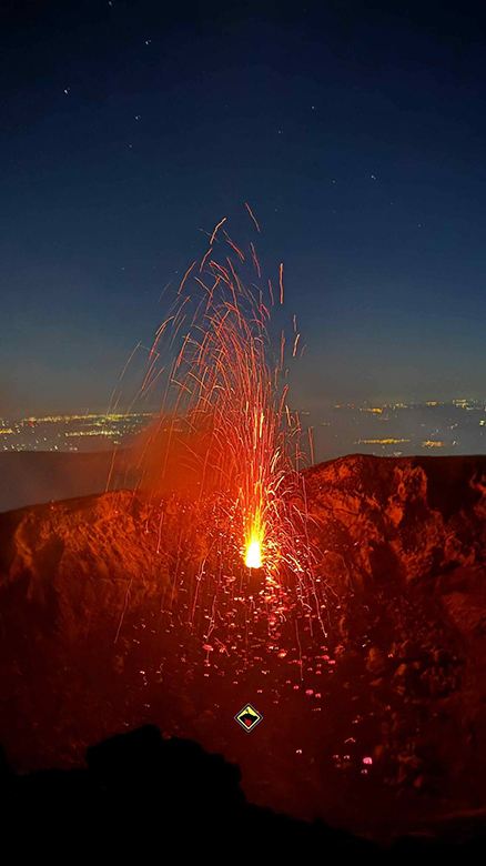 L’activité s’est intensifiée à l’intérieur du Cratère Nord-Est à partir du 24 décembre, et deux jours plus tard, les projections ont commencé à être visible au-dessus des rebords de ce cône volcanique. Cette activité explosive s’est lentement intensifiée, jusqu’à la journée du 27 décembre lors de laquelle deux courts paroxysmes se sont produits, avec des fontaines de lave de 300-400 mètres de haut entrecoupées de séquences avec des explosions bruyantes de bulles de lave projetant lambeaux de lave et blocs jusqu’à la base du cratère, soit au moins 1 km de distance ! Une colonne de cendres de quelques kilomètres de haut s’est aussi formée au-dessus du sommet du volcan, repoussée vers l’ouest par le vent.